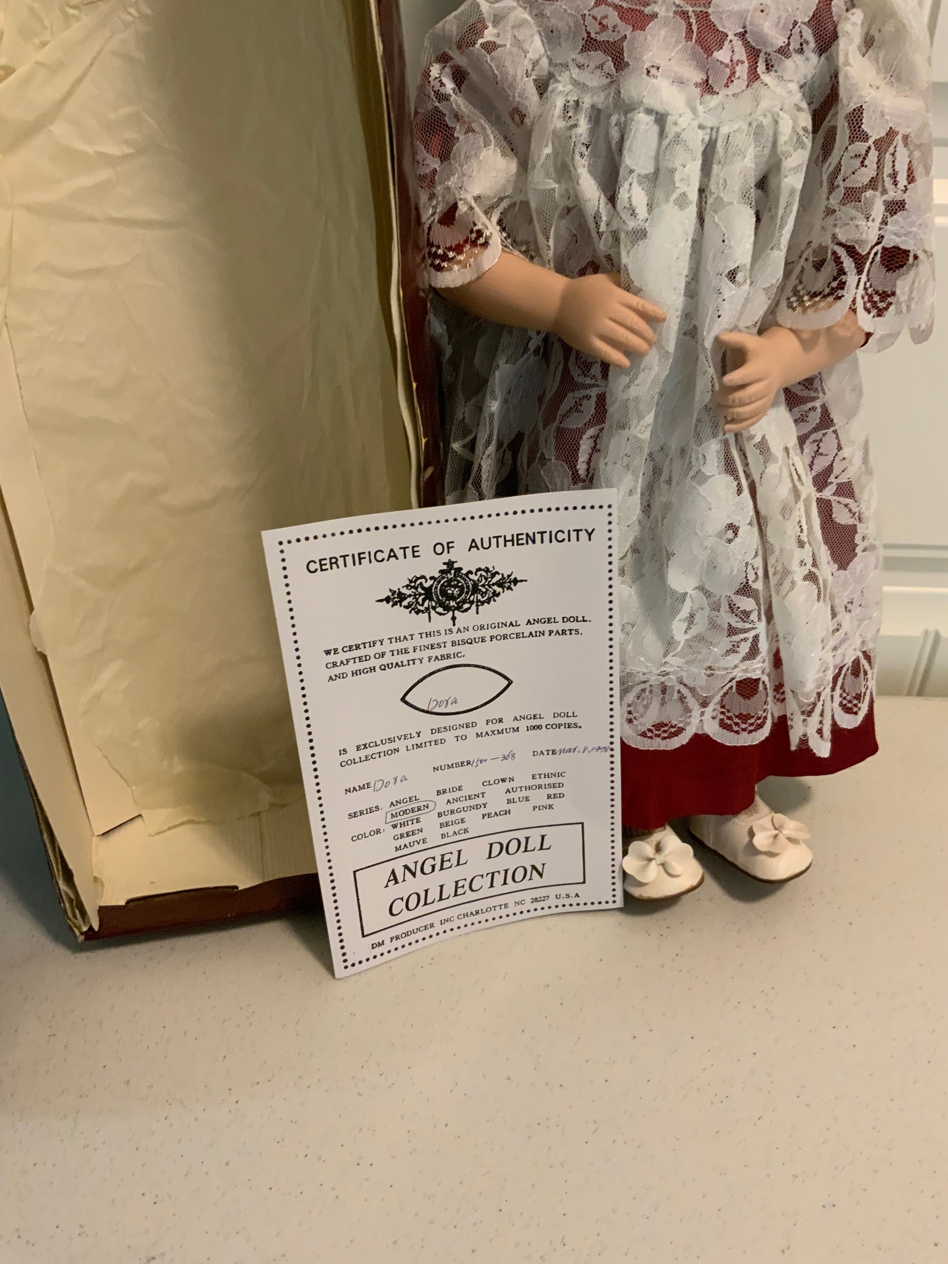 This vintage Porcelain Doll, named Dora, features a delicate porcelain construction, blonde hair, and a stunning red dress adorned with white lace. Each doll is individually numbered and dated to commemorate its creation in March 1978. Add a touch of nostalgic elegance to your collection with this one-of-a-kind doll.